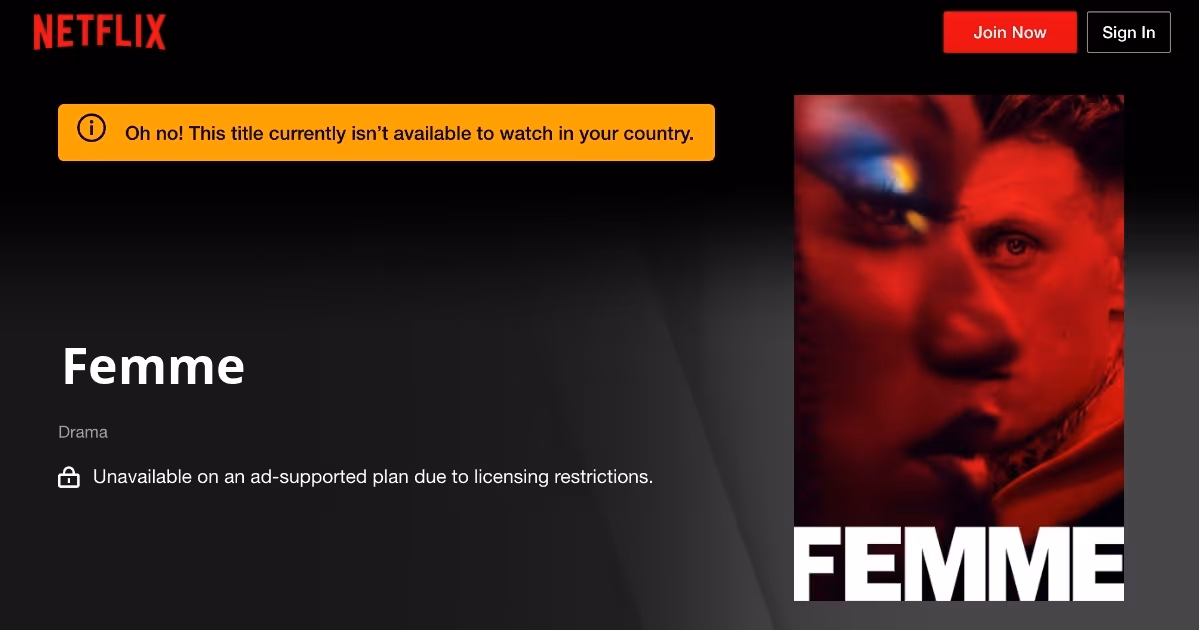 "Femme" is available for streaming on Netflix, but only in certain countries. This selective availability is due to licensing agreements and regional restrictions that vary from one country to another.