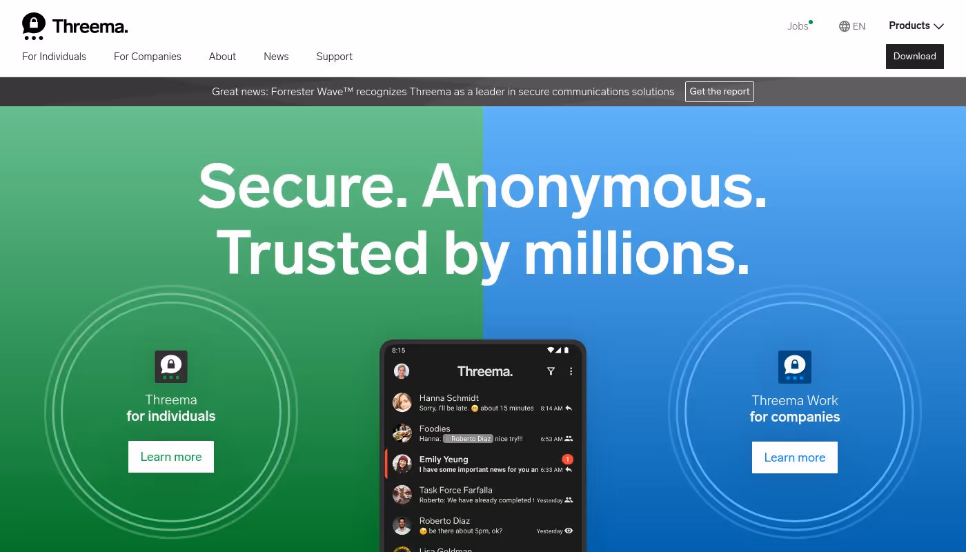 Threema is a secure messaging service designed for both individuals and companies. It offers end-to-end encryption, ensuring that only the intended recipient can read the messages. Users can communicate anonymously without needing to provide personal data like phone numbers or email addresses.
